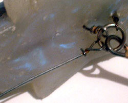 wire attached to split ring on belly hook.  Note also the belly hook 'pinned'