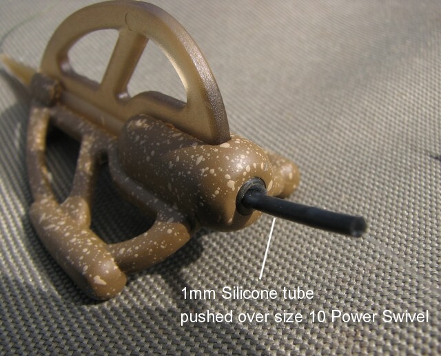 A larger swivel could be used for attaching the hooklink, but I like to make the link come out stiffly from the feeder using the silicone tubing to completely eliminate tangles. While I have mostly been using two grains of plastic corn the rig works equally well with other baits, popped up or on the bottom. Last year I was using a helicopter variant as my maggot feeder rig, but changing hooklinks was a bit of a pain and I was never convinced that it was all that good a rig anyway. Although this one uses more components than I'd really like it is pretty simple, and easily converted to a straight leger rig. I don't like quick-change connectors between my main line and hooklink, preferring to retie the knot. It takes only a few seconds longer, ensures that the knot isn't neglected and makes the rig more streamlined. Click on the pictures to enlarge them.