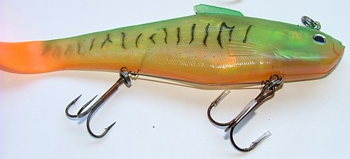 Step one: Cut off the large jig hook. Step two: Add a split ring to the line tie. Step three: Make up a wire harness to rig a 3/0 treble towards the back of the bait. | |