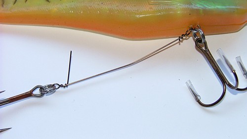 | Close up of the wire harness - made from single strand leader material to allow the end of the wire to be pushed in the bait and let the treble hang free. | |